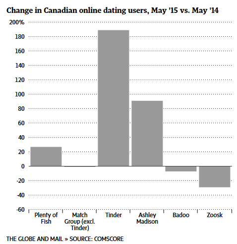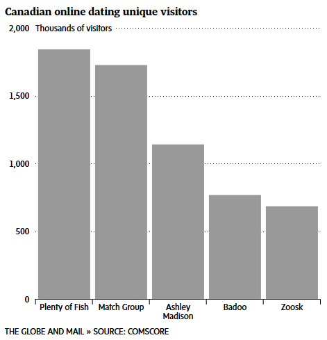 THE GLOBE AND MAIL – July 16 – PlentyOfFish notched ~1.85M unique visitors in May, according to data from comScore, making it the most visited dating site in Canada. Match Group sites came in second, at 1.73M unique visitors for the month. Tinder received 670K unique Canadian visitors in May, a 189% rise YOY. Match Group posted visitor growth of 33% YOY. But minus Tinder, it saw a 0.84% decrease in visitors.