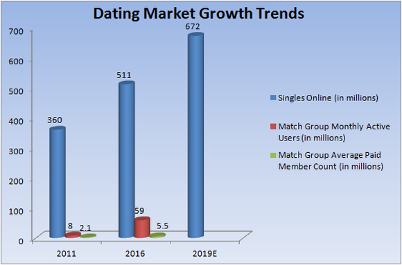 THE MOTLEY FOOL – Jan 3 – Since 2011, the online dating market has grown ~42%, according to Match. In 2011, there were 360M singles online looking for a partner, and at that point, Match had a monthly active user count of 8M, representing ~2% of the market. In 2016, Match has a monthly active user count of 59M and the number of single people online looking for partners has grown to 511M. That gives Match a hand in 11.5% of the online dating market. In the next four years, Match expects the number of single people online to grow another 31%.