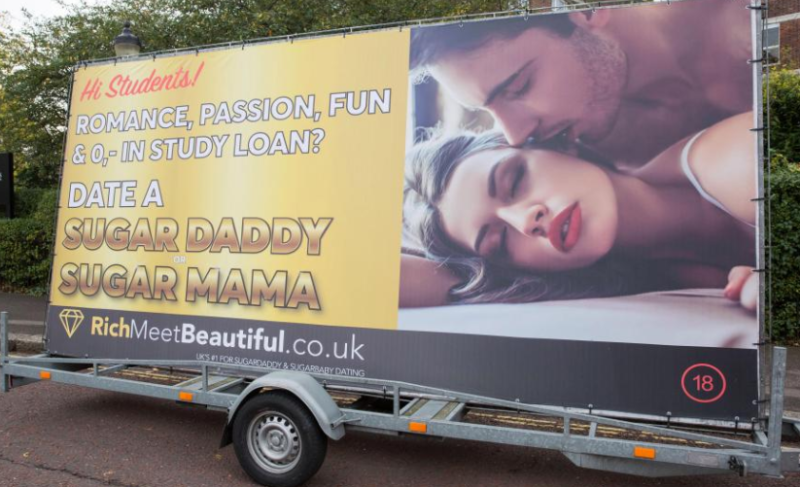 THESUN.CO.UK – Nov 11 – Huge adverts for RichMeetBeautiful show a couple cuddling with the caption "romance, passion and no student loan, go out with a sugar daddy". On their website the Norwegian company describes itself as a "sugar daddy and sugar baby dating site" but has been accused of encouraging prostitution and preying on the financial insecurity of students. The advertising campaign will target more than 12 universities for next three months and CEO Sigurd Vedal claims 75% of new signups are women, many of whom are aged between 18-26. As well as King's College London, the billboards will be displayed at the London School of Economics and The City Law School.