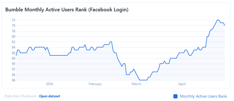 THINKNUM – May 2 – In response to privacy concerns, dating app Bumble on April 16 announced that it would no longer require its users to login via Facebook. However, data shows that users don't seem to mind the Facebook login protocol. Since the announcement user ranks on Facebook for Bumble climbed more than they had in months.