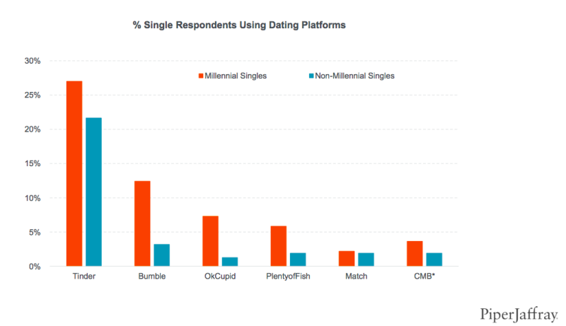 YAHOO FINANCE – June 5 – Millennials are using Tinder more than any other dating app, according to a new survey of young consumers from Piper Jaffray. Of the 294 respondents who indicated that they were single, 27% of single millennials said they use Tinder (vs. 22% of single non-millennials), which is more than double that of Bumble at 12% of millennials (vs. 3% of non-millennials). The Piper Jaffray survey was conducted in April. The firm collected responses from 750 young adults.