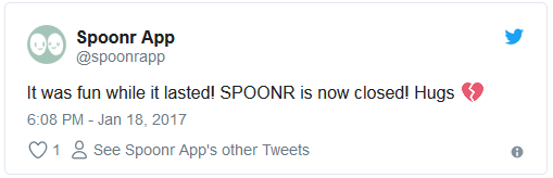 First called Cuddlr, the app launched in 2014 to help people find platonic cuddle buddies. Cuddlr shut down in 2015 and rebranded as Spoonr months later. Spoonr closed in 2017 with a tweet: "It was fun while it lasted! SPOONR is now closed! Hugs." - Siren