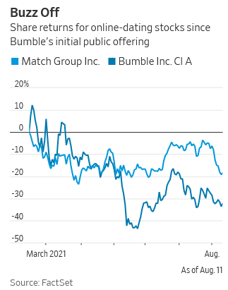 WALL STREET JOURNAL – Aug 12 – After a solid Q1, Match Group and Bumble reported Q2 earnings that topped Wall Street's expectations. But after significant gains earlier this year for both stocks, even big numbers have done little to keep the fire alive. As of Wednesday's close, Match's shares were down 7% this year, including a 12% selloff this month. And while Bumble's shares soared on their first day of trading in February, closing 63% above their offering price, they have lost 32% of their value since. Chances are, some of those losses will linger. In part because of Covid-19's impact, Match's Q3 revenue guidance last week came in slightly below analysts' forecast, excluding Hyperconnect. Bumble's guidance looked solid for the Q3. Full-year guidance shows both companies expect the period to end on a high note.