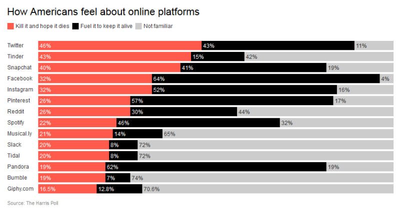RECODE – Jan 6 – Millions of Americans use social media daily. But that doesn't mean they love it. Some of the most-used social media products in the world – Twitter, Snapchat, Facebook and Instagram – are also some of the ones that Americans have strong negative feelings about, according to a recent Harris Poll survey. Tinder was also largely disliked. ~43% of people want it to go away.